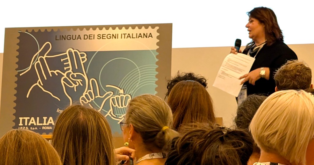 Gruppendiskussion über Allyship: Meine Gruppe kam zum Schluss, dass für stärkere Allyship ein top-down und ein Button-up Ansatz gleichermaßen förderlich wäre. Buttom-up, weil wir in einer immer polarisierteren („schwarz-weiss-denkenden“) Gesellschaft leben, wo taub-hörend als natürlicher Gegensatz in Stein gemeißelt wird. Es gibt schon Gegenbewegungen zu diesem allgemeingesellschaftlichen Trends. Ich bin zum Beispiel Teil des Pocket-Projekts, einer globalen Bewegung, die diesem Trend entgegenwirkt. Da wir hörenden privilegiert sind im Zugang zu solchen Bewegungen und ihren Bildungsangeboten, können wir zuerst bei uns selbst anfangen und gleichermaßen an unserer eigenen geistigen Reflexion zu unserer Offenheit sowie an unserer Beziehungskompetenz (Emotional IQ) arbeiten. In der kollektivistischen Gehörlosengemeinschaft sind gute persönliche Beziehungen sowieso die Bedingung zur Zusammenarbeit. Das kann jede:r von uns selbst, also von unten, Leisten. Auf der Verbandsebene, höher im System, ist eine Vorbild gebende Zusammenarbeit von Dolmetschverband und Gehörlosenverband ausschlaggebend, das sehen wir am Beispiel Belgien. Die erzählen auch, dass auf Systemebene, also top-down, bestimmte Rahmenbedingungen hilfreich sind, die Konkurrenzkämpfe um Ressourcen aus dem Weg räumen: Der Staat fördert und bezahlt den Einsatz von gemischten Teams. Die Belgier, hier zwei junge Vertreter:innen unseres Berufsstands, kennen es gar nicht anders als harmonisch mit den tauben Kolleg:innen und Kund:innen. Whow, das macht Hoffnung.